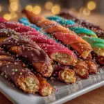 These colorful lightsaber pretzel rods are a fun, crunchy, and sweet snack perfect for kids and parties. They are easy to make with simple ingredients and customizable candy melt colors and sprinkles.