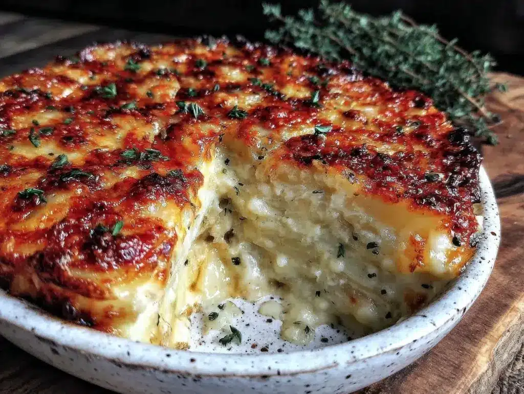 A rich and velvety au gratin potato dish featuring tender russet potatoes baked in a creamy béchamel sauce blended with cottage cheese and topped with nutty Gruyere and Parmesan cheeses. Perfect for cozy dinners and easy enough for weeknights.