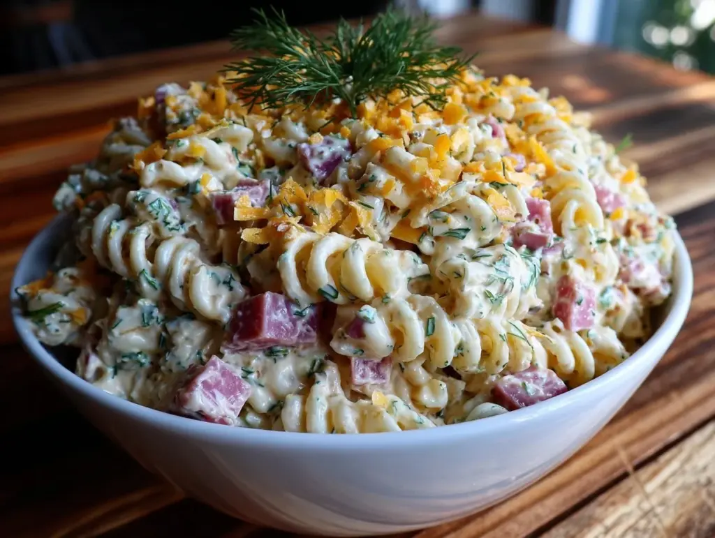 A quick and easy creamy dill pickle pasta salad featuring smoked ham and sharp cheddar, perfect for picnics, BBQs, and casual dinners. This tangy and smoky salad is a crowd-pleaser with a unique flavor twist.