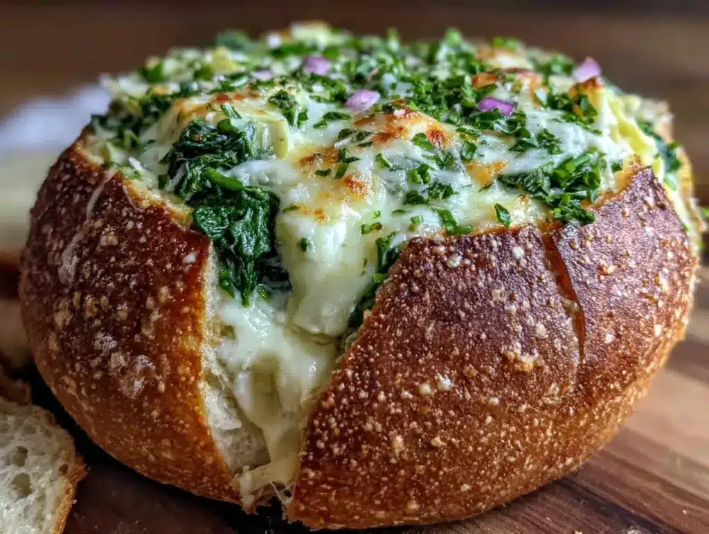 A warm, gooey, and creamy spinach artichoke dip served in a hollowed-out sourdough bread bowl, perfect for parties and casual get-togethers.