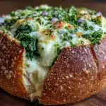 A warm, gooey, and creamy spinach artichoke dip served in a hollowed-out sourdough bread bowl, perfect for parties and casual get-togethers.