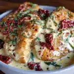 This Creamy Tuscan Chicken recipe features juicy chicken breasts simmered in a rich, garlicky cream sauce with sun-dried tomatoes, spinach, and parmesan. It’s a quick, comforting dinner perfect for family gatherings or cozy weeknights.