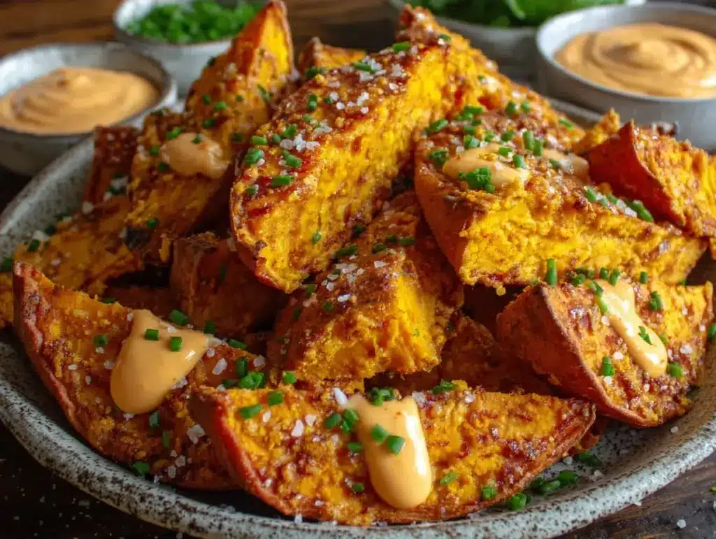 These crispy baked sweet potato wedges are tossed in a smoky, savory seasoning and baked to golden perfection, then served with a creamy, spicy sriracha mayo dip. Perfect for snacking, parties, or as a healthy side dish.