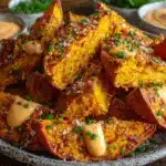 These crispy baked sweet potato wedges are tossed in a smoky, savory seasoning and baked to golden perfection, then served with a creamy, spicy sriracha mayo dip. Perfect for snacking, parties, or as a healthy side dish.