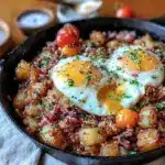 Keywords: corned beef hash, breakfast skillet, crispy hash, fried eggs, easy breakfast, brunch recipe, comfort food