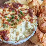A creamy, cheesy crab dip paired with crispy homemade wonton chips, perfect for quick snacks and casual get-togethers.