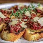 Keywords: grilled bread, romesco sauce, Manchego, tapas, appetizer, Spanish recipe, easy snack, smoky sauce
