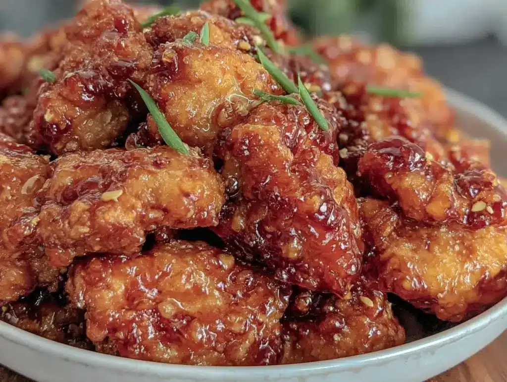 Pro tip: Keep the oil temperature steady — too hot and the coating burns, too cool and the chicken gets greasy. Also, double frying is key to that signature crunch that holds up under the sticky sauce. Trust me, it’s worth the extra step.