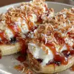 A quick and easy grilled banana split dessert featuring caramel drizzle and toasted coconut, perfect for summer gatherings and a crowd-pleasing treat.