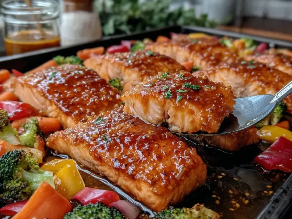 Keywords: sheet pan salmon, honey garlic salmon, roasted vegetables, easy dinner, healthy salmon recipe, weeknight meal, gluten-free, dairy-free, meal prep, quick salmon recipe
