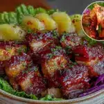 A hearty and fresh Korean-inspired bowl featuring tender caramelized pork belly marinated in gochujang, paired with pickled daikon, kimchi, and fresh lettuce for wrapping. Perfect for fans of bold, spicy, and tangy flavors.
