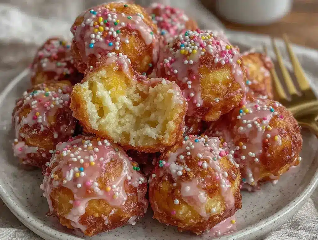 Keywords: donut holes, pink frosting, rainbow sprinkles, easy dessert, fried donuts, party treats, bake sale, kid-friendly, nostalgic, comfort food