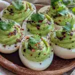 A quick and easy snack featuring creamy avocado filling in hard-boiled eggs, seasoned with tangy Tajín and fresh cilantro for a flavorful twist on classic deviled eggs.