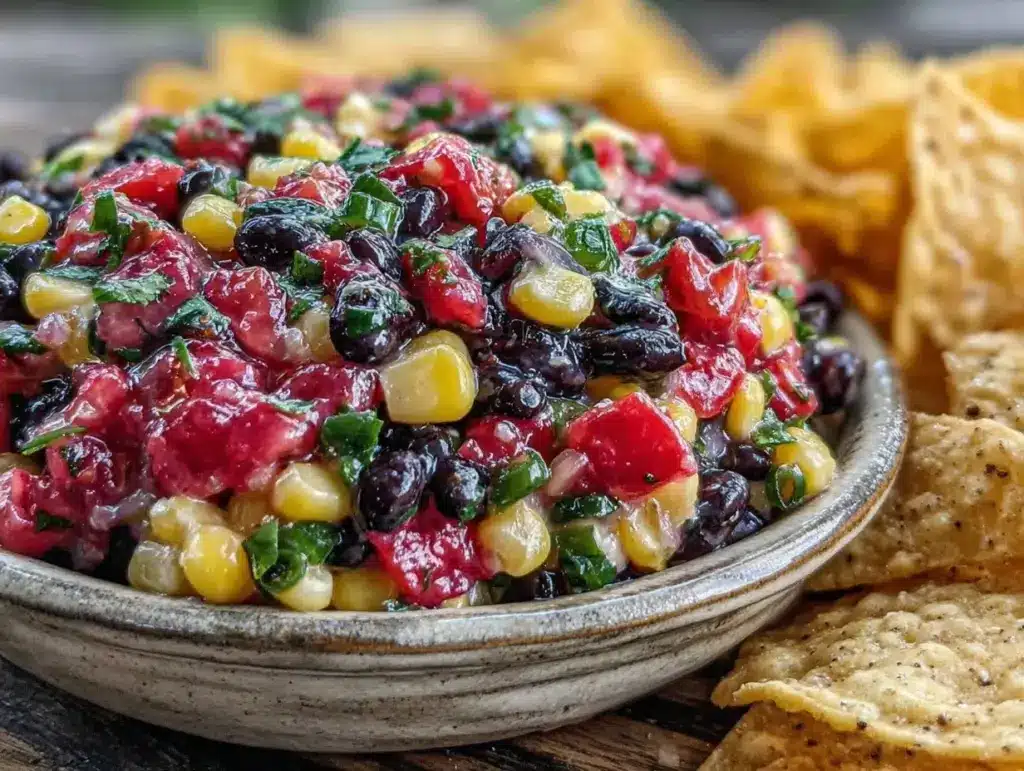 A vibrant and flavorful dip made with black beans, corn, fresh veggies, and zesty lime, paired with homemade crispy tortilla chips. Perfect for quick snacks, parties, or casual get-togethers.