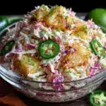 A vibrant and refreshing coleslaw combining crunchy cabbage, juicy pineapple, spicy jalapeno, and zesty lime for a sweet and spicy side dish perfect for summer gatherings.