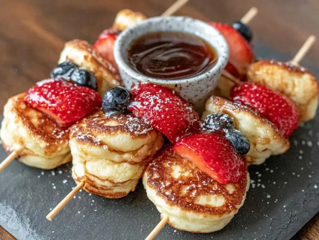 Keywords: mini pancakes, pancake skewers, breakfast kabobs, brunch, maple syrup dip, kid-friendly, easy breakfast, fruit skewers, party food, fun breakfast