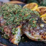 A quick and easy grilled whole branzino recipe featuring a vibrant, herbaceous North African-inspired chermoula sauce. Perfect for outdoor gatherings and packed with bold, fresh flavors.
