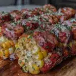 Keywords: grilled corn, andouille sausage, Old Bay butter, summer BBQ, skewers, smoky, spicy, easy recipe
