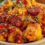 A flavorful and easy-to-make savory stuffing combining buttery cornbread and smoky chorizo, perfect for holiday sides and family gatherings.
